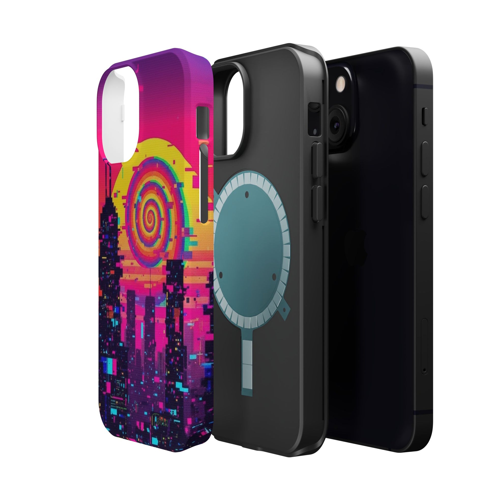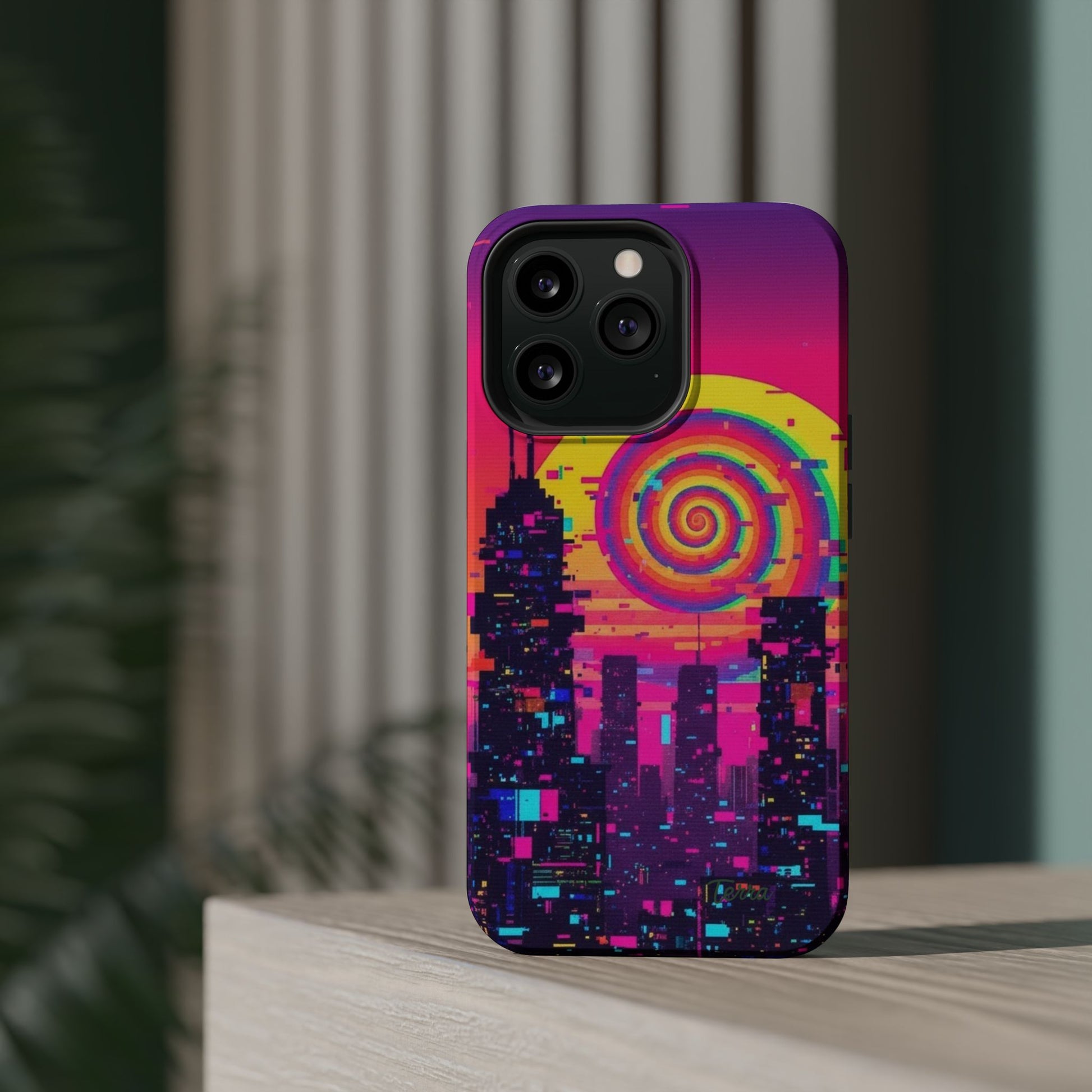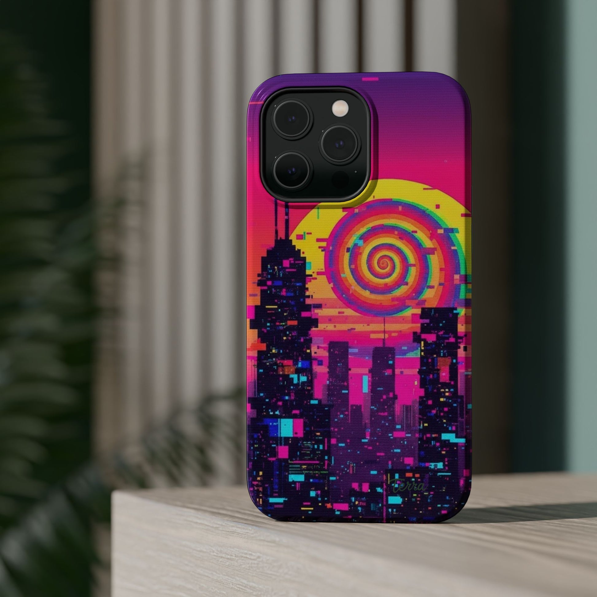 At the edge of the city, the sun becomes a luminous spiral, pulling fragments of neon from windows, signs, and streetlights into a slow, bright orbit. That nightly glitch—the Vortex Hour—turns alleys into galleries and commutes into color. This case channels that energy: a skyline alive with pixel sparks, a radiant swirl that proves protection can be beautiful. Slip it on, and carry the Vortex wherever your day spins next.