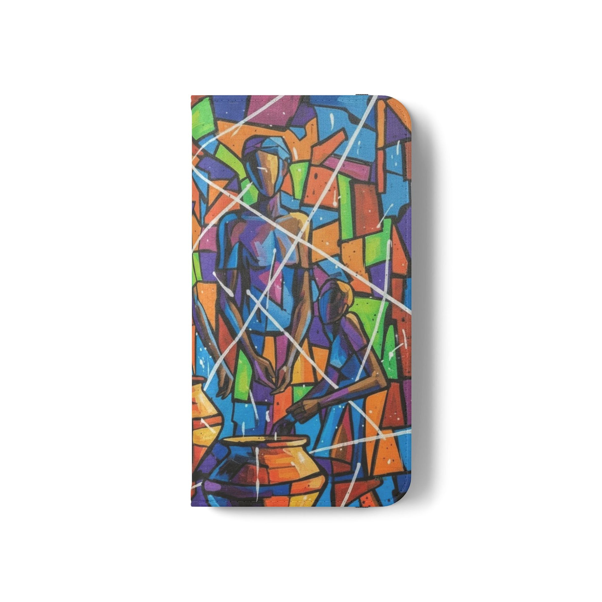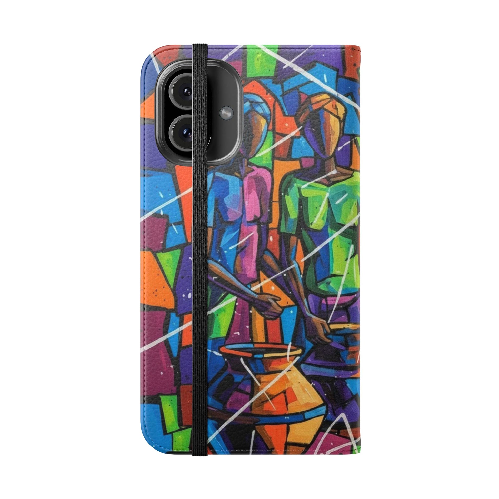 Introducing a beautifully crafted flip wallet case that seamlessly merges functionality with artistic flair. It features a bold, abstract drummer scene rendered in a kaleidoscope of colors, guaranteed to make any device stand out on the go.